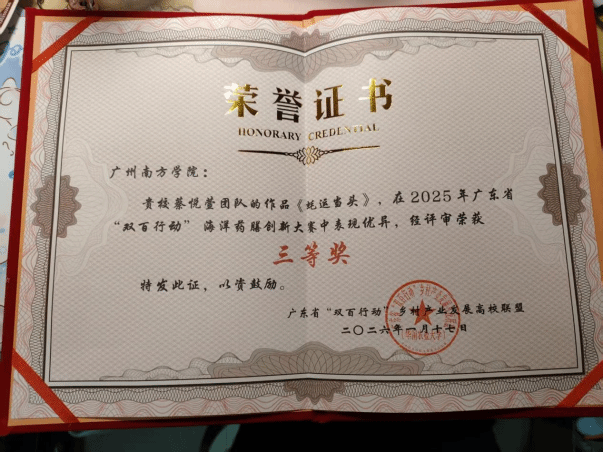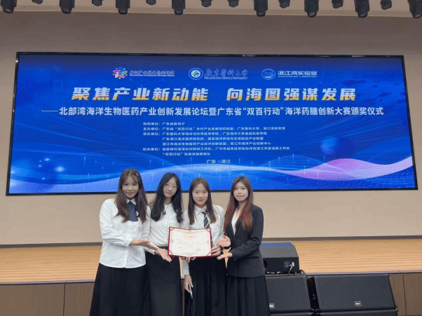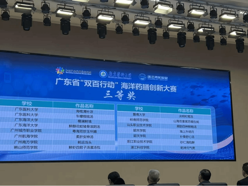 2026年1月17日,广东省“双百行动”海洋药膳创新大赛颁奖仪式在湛江举行,由我院首届“药膳康养”微专业任课教师赵晶牵头,联合高辉、朱宪国共同指导的蔡悦萱、张建华、罗婕妤、陈雅文同学一起推出参赛作品“蚝运当头”,经过初赛、复赛层层闯关,荣获本次大赛三等奖。