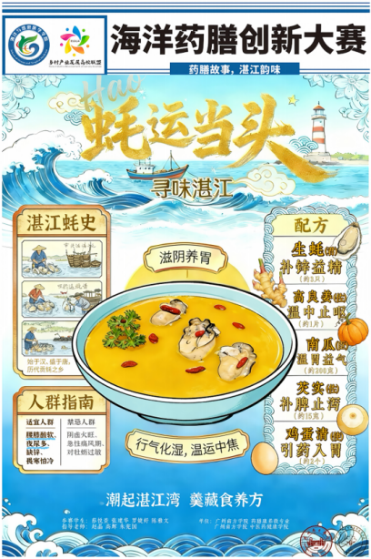 本次参赛作品“蚝运当头”,围绕湛江特色生蚝药膳创作,核心是把中医“辨证施膳”理念和湛江海洋特色风情结合起来。食材搭配上以“药食同源”和“君臣佐使”为配伍原则,其中生蚝为主(君),能滋阴潜阳,益肾固精,搭配温中止呕的高良姜(佐药)、益气健脾的南瓜(臣),再加上补脾止泻的芡实(佐药)和调和口感的鸡蛋清,既能行气化湿,又能温养中焦。同时还明确标注了适用人群,湿气重、脾胃虚寒的人较合适,阴虚火旺者建议慎食,用直白的说法传递专业食疗知识,避免专业术语堆砌,方便大家理解。