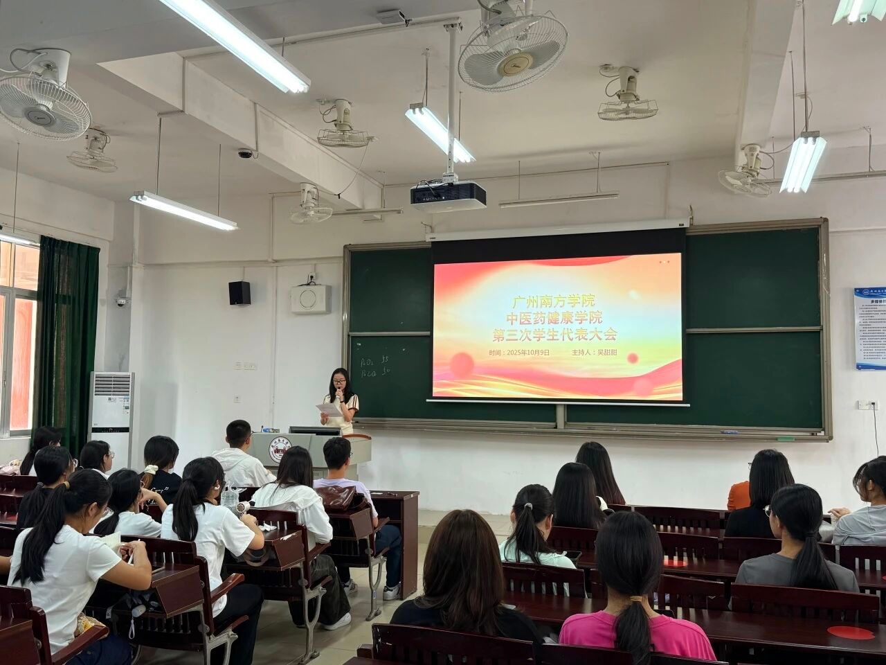 2025年10月9日,广州南方学院中医药健康学院第三次学生代表大会在庄严隆重的氛围中胜利召开。学院老师及50名正式学生代表出席了会议,共同履行神圣职责,擘画学院学生会工作新篇章。