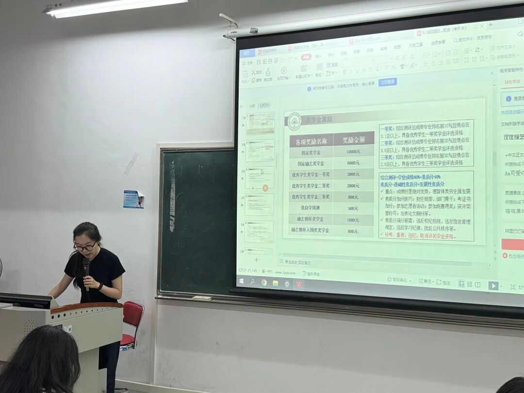 在奖学金介绍环节,吴甜甜老师详细介绍了学校针对全体同学设立的奖学金政策。奖学金种类包括:国家奖学金、国家励志奖学金、学校奖学金、优良学风班、优秀学生奖学金、学校励志奖学金。