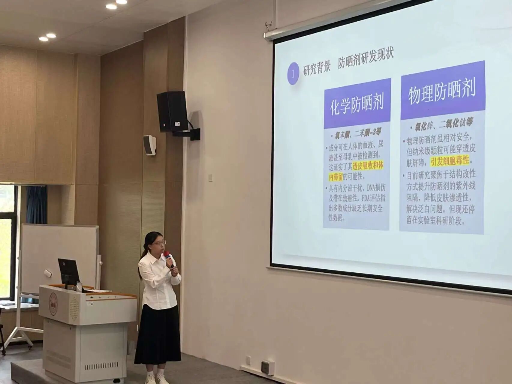 江子璐小组聚焦中药防晒剂的开发安全性问题,以黄芩为核心成分展开研究,验证该成分在紫外线防护与抗氧化方面的双重功效,为中药在现代护肤领域的应用提供了实验依据。
