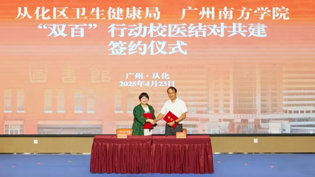 2025年4月,广州南方学院与从化区卫生健康局、从化区中医医院举行“双百”行动医校结对共建签约揭牌活动,双方签署战略合作框架协议,并揭牌成立“广州南方学院临床教学基地”。此次活动是落实百校联百县助力“百县千镇万村高质量发展工程”的具体行动,双方将围绕医教研协同、人才培养、中医药文化建设等方面深化合作,共同推动区域卫生健康事业高质量发展,为建设“健康从化、幸福从化”贡献力量。