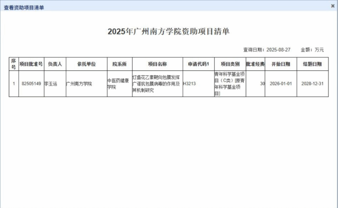 2025年8月,李玉运博士申报的《灯盏花乙素靶向包膜发挥广谱抗包膜病毒的作用及其机制研究》成功获批国家自然科学基金青年科学基金项目(C类),获资助经费30万元。在竞争异常激烈的背景下,我院连续3年实现国家自然科学基金青年项目立项,目前拥有4项国自然青年基金项目。该项目聚焦新现包膜病毒防治关键难题,旨在为开发广谱抗病毒药物提供新思路,凸显学院在中医药健康领域的基础研究积累与创新潜力。学院将持续加强科研投入与平台建设,为推动中医药现代化与民办高校科研高质量发展贡献更大力量。