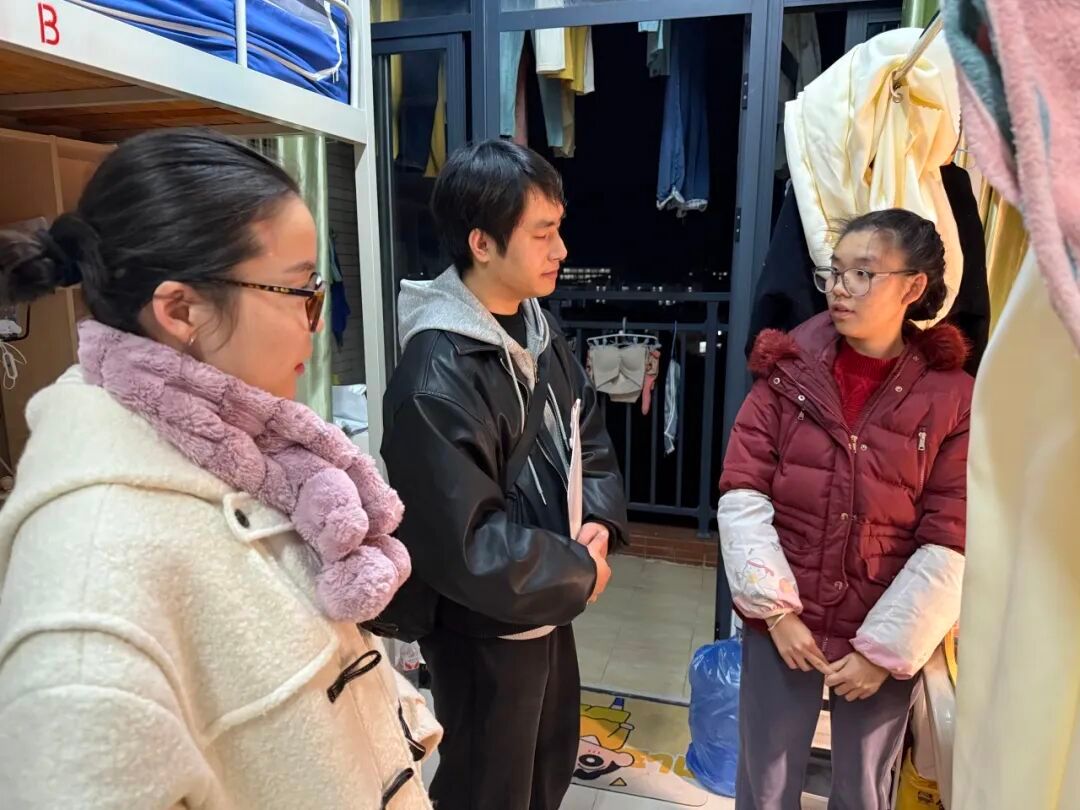 走访老师将温暖的叮嘱送到每一间宿舍。他们细心查看室内温度与通风情况,像家人般提醒同学们:“最近天气冷,出门一定要加件外套,特别注意头部、肩背和脚部的保暖。”老师们还分享道,在饮食上可以适当选择一些温润平和的食材,为身体增添能量。对于平时体质较弱或最近感到有些疲劳的同学,老师们格外关切,耐心询问情况,并叮嘱要多休息,如有需要应及时寻求帮助。一句句朴实的提醒,承载着学院对同学们身体健康的深切关怀,让冬日备考的时光充满暖意。